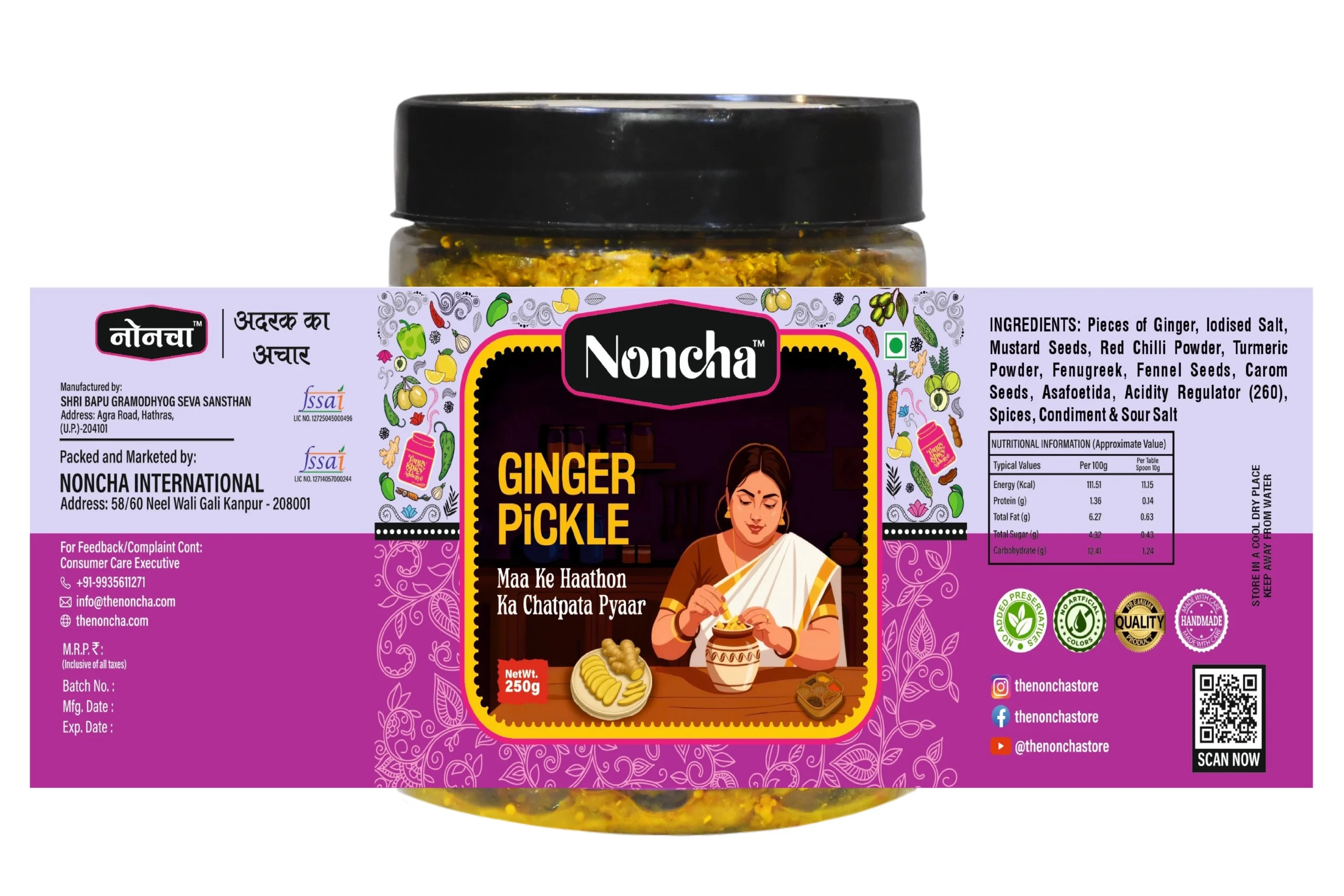 Enjoy the bold flavor of fresh ginger blended with authentic Indian spices. Our Ginger Pickle offers a rich, spicy, and tangy taste that enhances every meal—whether served with parathas, dal-chawal, curd rice, idli, dosa, or snacks. Made using a traditional recipe with pure ingredients, this pickle delivers warmth, aroma, and a delicious homemade-style touch in every bite.