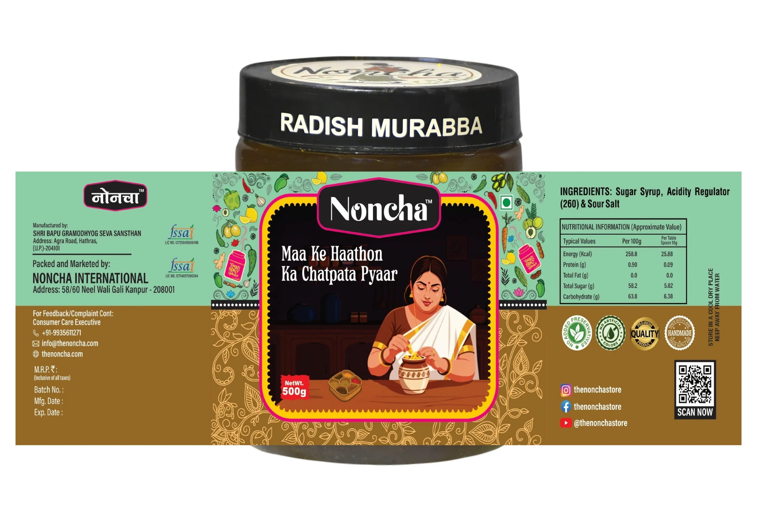 Prepared using fresh, handpicked radishes and carefully simmered in sugar syrup with cardamom, cinnamon, and other traditional spices, this murabba offers a burst of flavor in every bite. Its sweet and mildly spiced taste makes it perfect for pairing with parathas, rotis, or even enjoying on its own as a digestive-friendly treat.